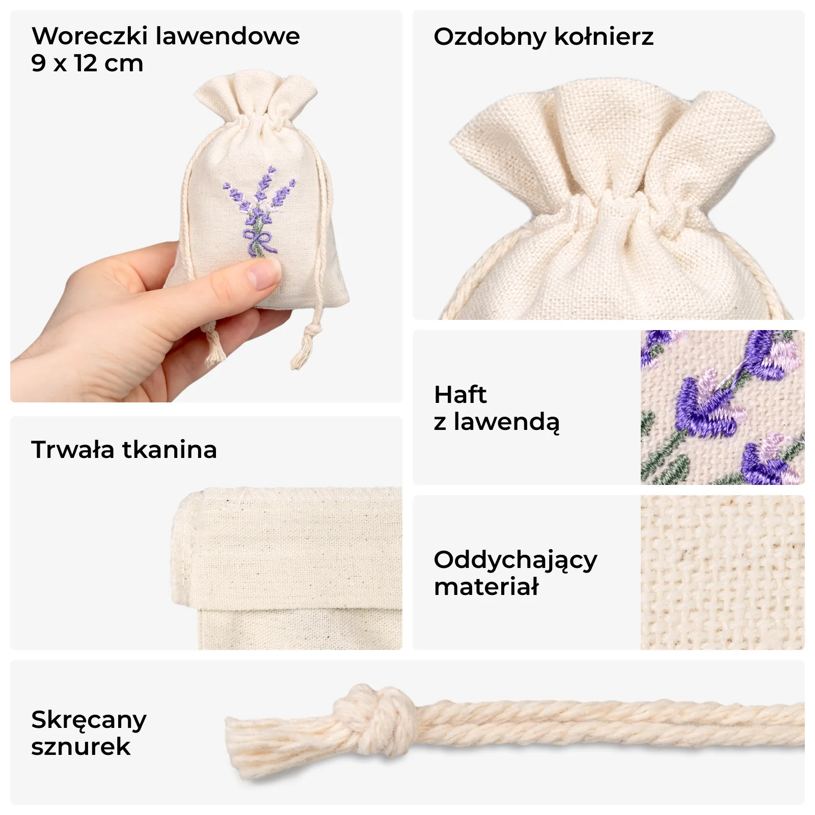 - Haft lawendy - subtelny motyw roślinny nadający woreczkom wyjątkowego uroku,
