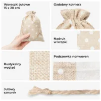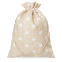 5 jasnych woreczków jutowych 15x20 cm - z kołnierzem i groszkowym nadrukiem