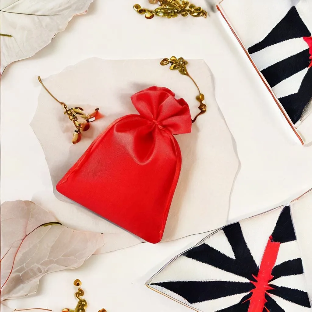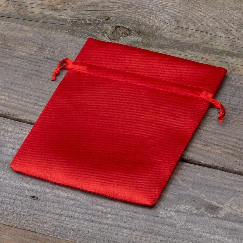 Kolekcja ozdobnych woreczków z czerwonej satyny o wymiarach 10 x 13 cm w ilości 10 sztuk.