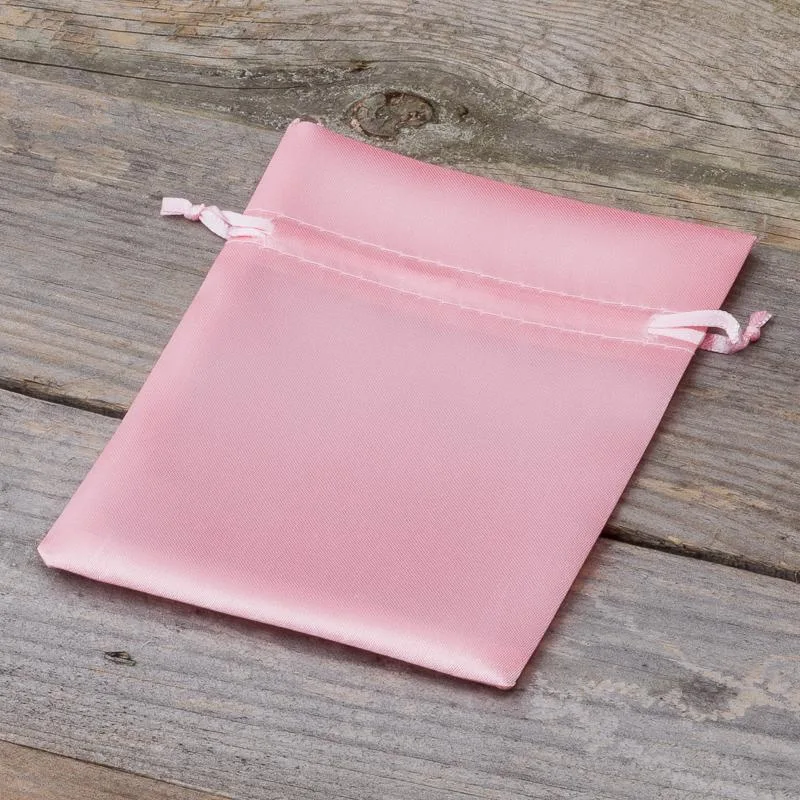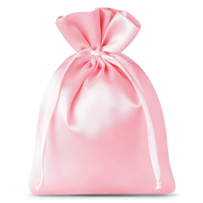 Kolekcja ozdobnych woreczków z jasno różowej satyny o wymiarach 10 x 13 cm w ilości 10 sztuk.