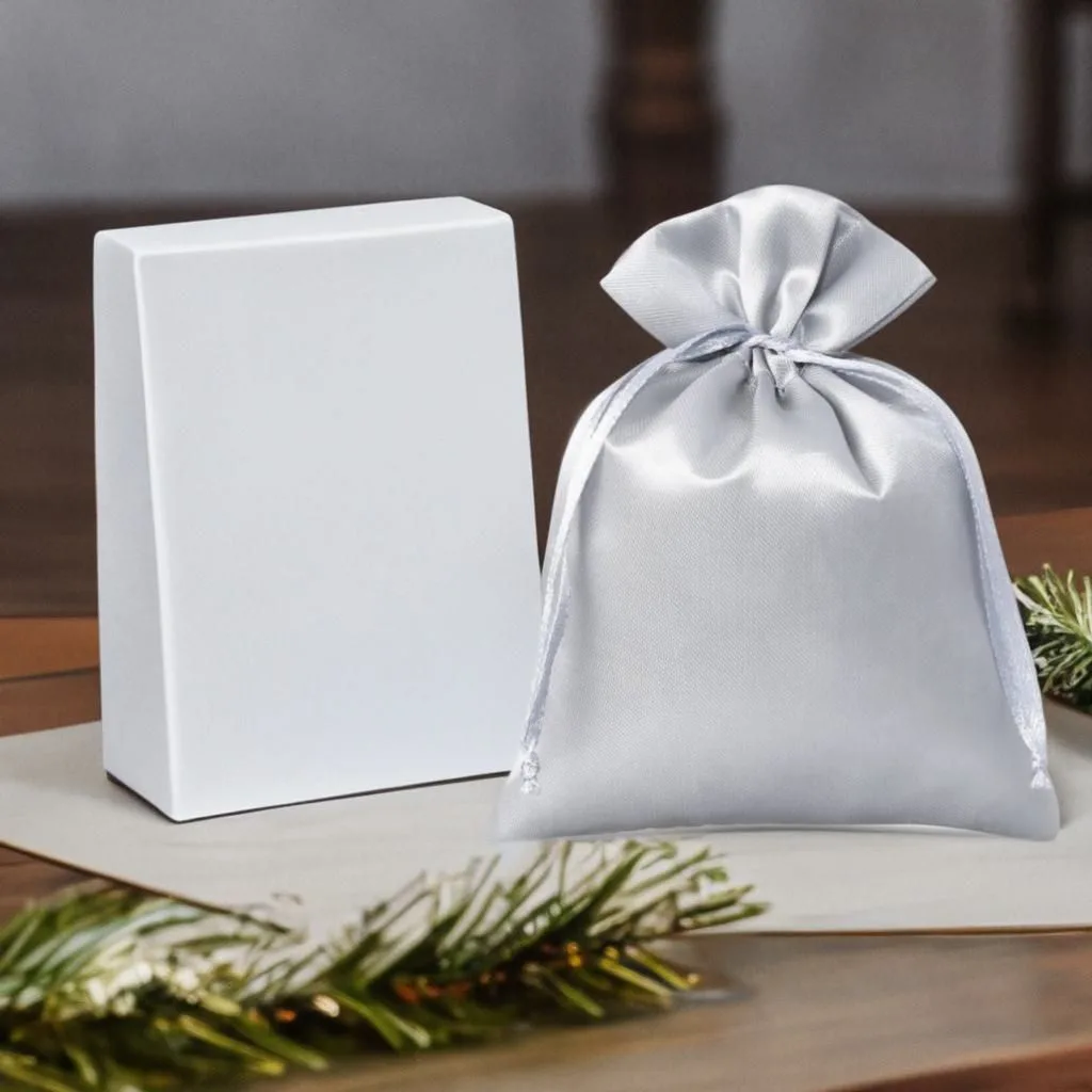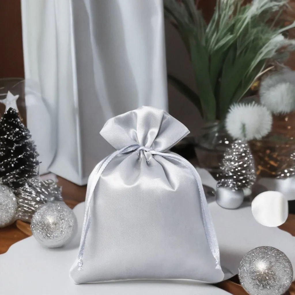 Kolekcja ozdobnych woreczków ze srebrnej satyny o wymiarach 10 x 13 cm w ilości 10 sztuk.