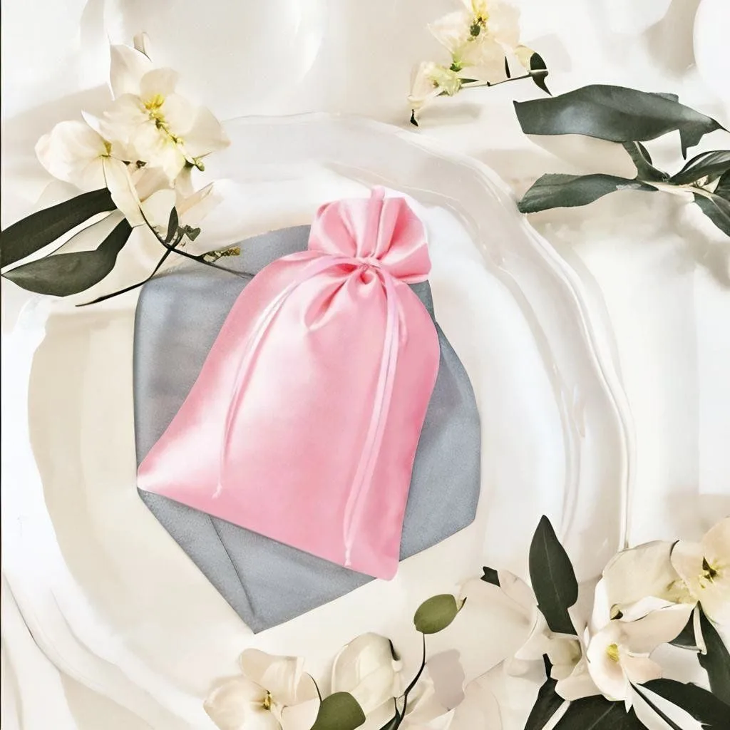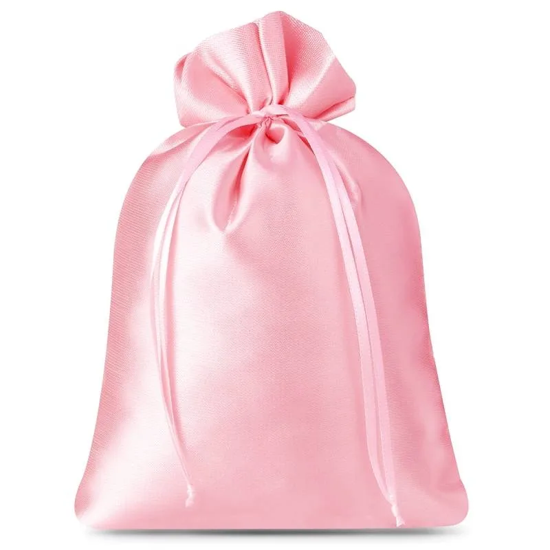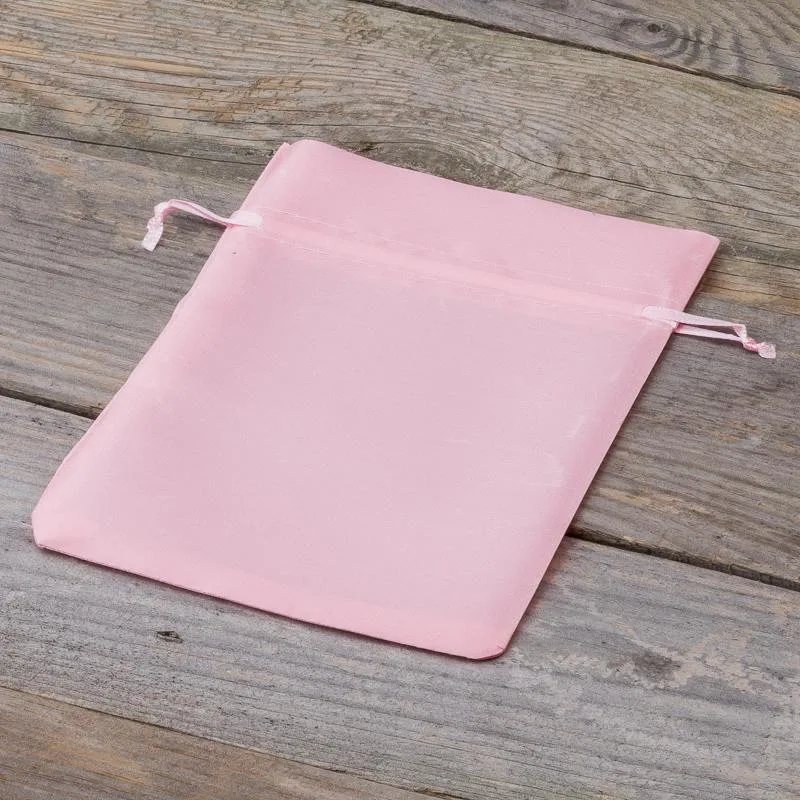 Kolekcja ozdobnych woreczków z jasno różowej satyny o wymiarach 12 x 15 cm w ilości 10 sztuk.