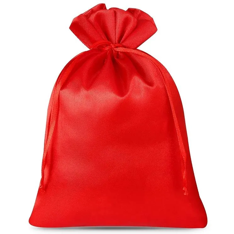 Pakiet 5 sztuk ozdobnych woreczków satynowych o wymiarach 18 x 24 cm w kolorze czerwonym.