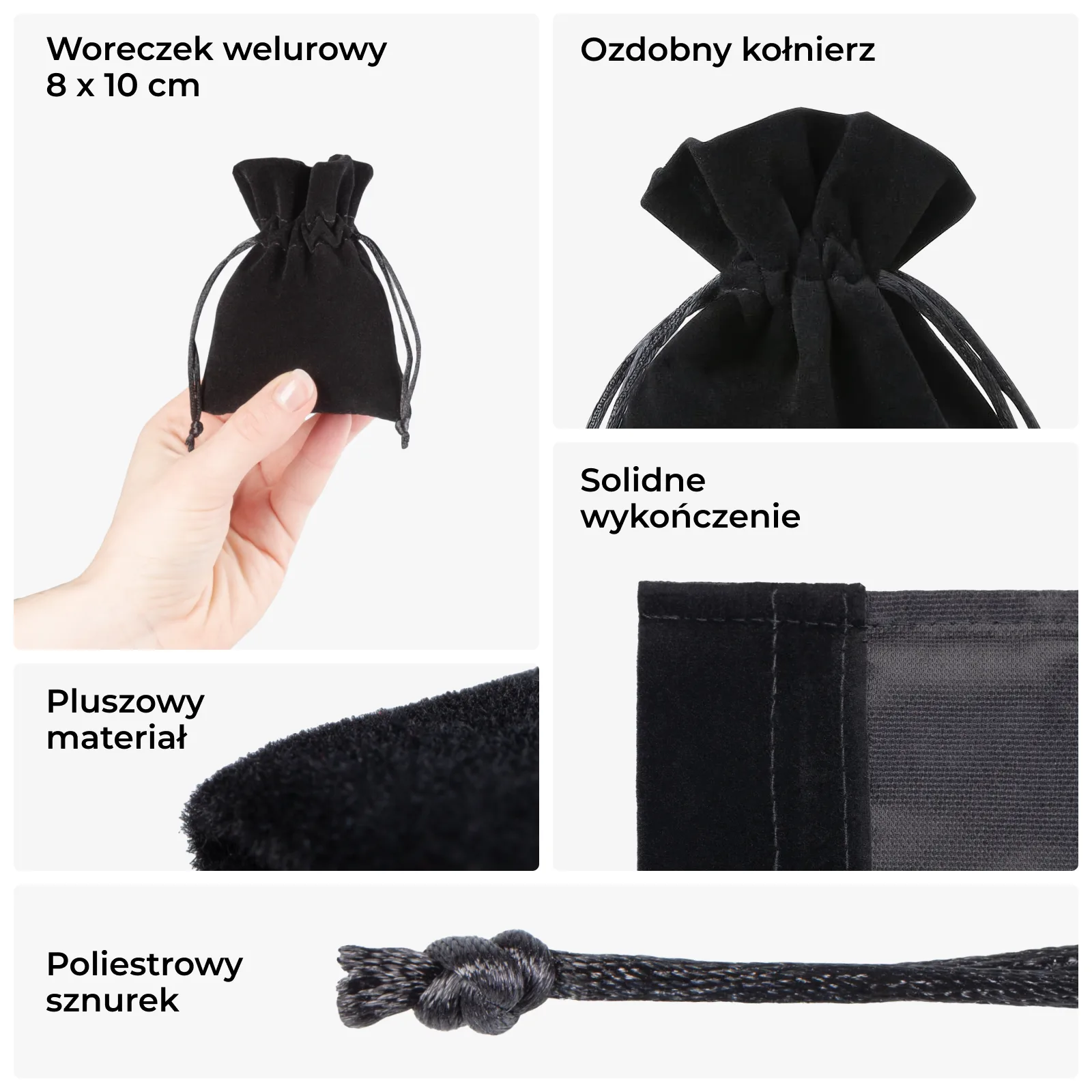 Te eleganckie, małe woreczki welurowe wyróżniają się miękką fakturą, subtelnym połyskiem i trwałością. Czarne wykończenie pasuje do produktów premium i skutecznie podkreśla charakter biżuterii oraz drobnych upominków. Podwójny sznurek zwiększa funkcjonalność i pozwala na wielokrotne użytkowanie.