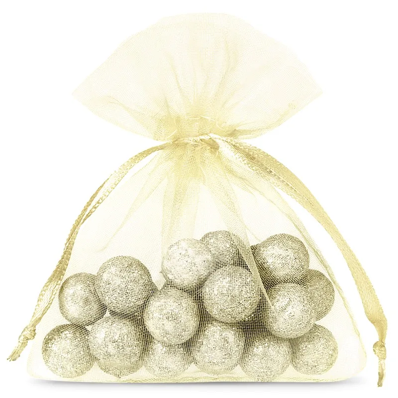 Zestaw niedużych woreczków z organzy o wymiarach 10 cm x 13 cm w kolorze ecru. Ten praktyczny pakiet zawiera w sobie 25 sztuk, dzięki czemu jednorazowy zakup wystarczy na dłuższy czas.