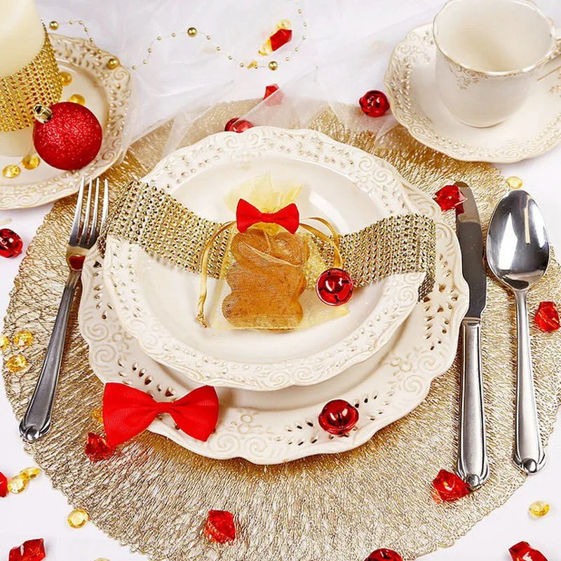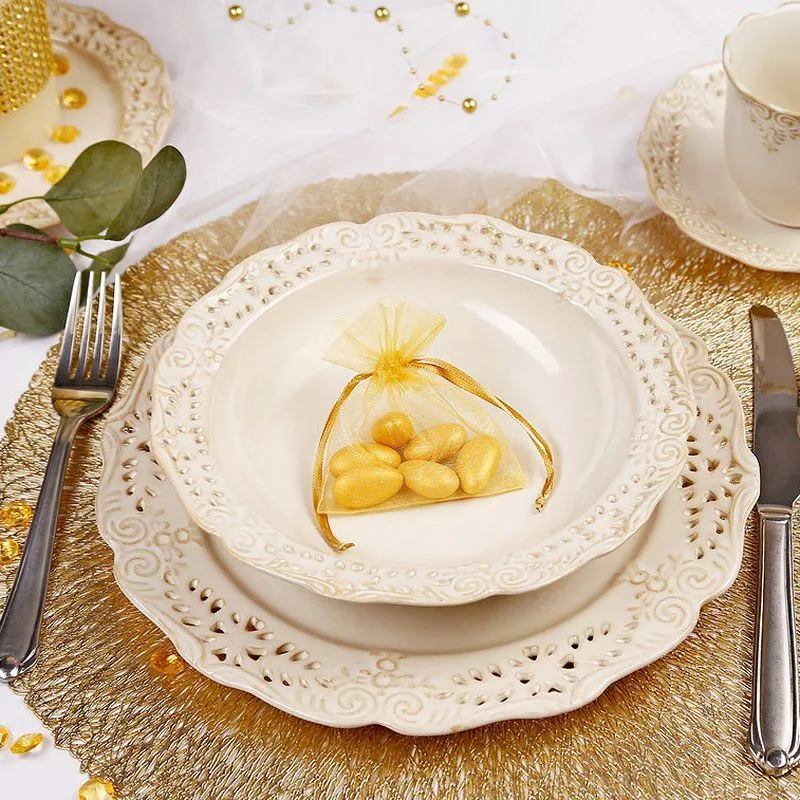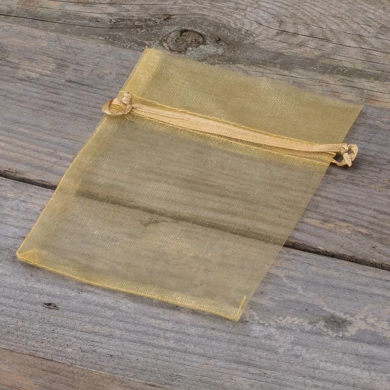 Zestaw niedużych woreczków z organzy o wymiarach 10 cm x 13 cm w kolorze złotym. Ten praktyczny pakiet zawiera w sobie 25 sztuk, dzięki czemu jednorazowy zakup wystarczy na dłuższy czas.