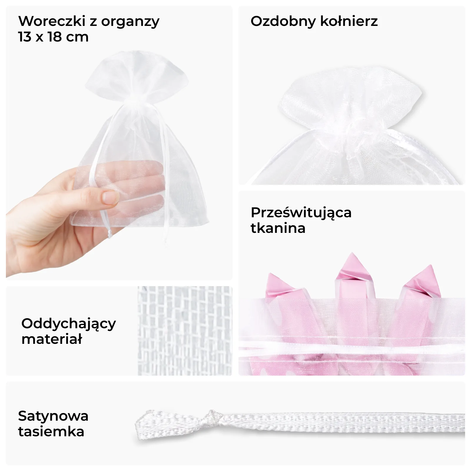 Oferowane w tym miejscu sakiewki uszyliśmy z organzy wykonanej ze 100% nylonu. Materiał jest lekki, przewiewny i posiada drobną siateczkową strukturę, która subtelnie eksponuje zawartość i dobrze uwalnia aromaty, dzięki czemu woreczki organzowe doskonale sprawdzają się przy pakowaniu drobnych upominków, zestawów zapachowych czy dekoracyjnych prezentów. Każdy woreczek wyposażony jest w podwójną satynową wstążkę zaciąganą z dwóch stron, co umożliwia szybkie zabezpieczenie zawartości oraz nadaje opakowaniu elegancki charakter. Biały kolor sprawia, że to uniwersalne opakowanie dopasowane do każdej okazji.