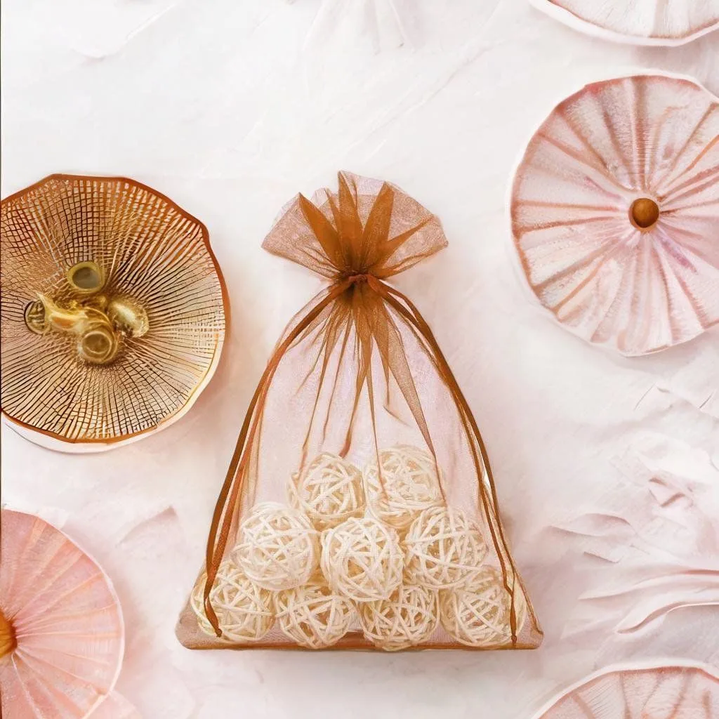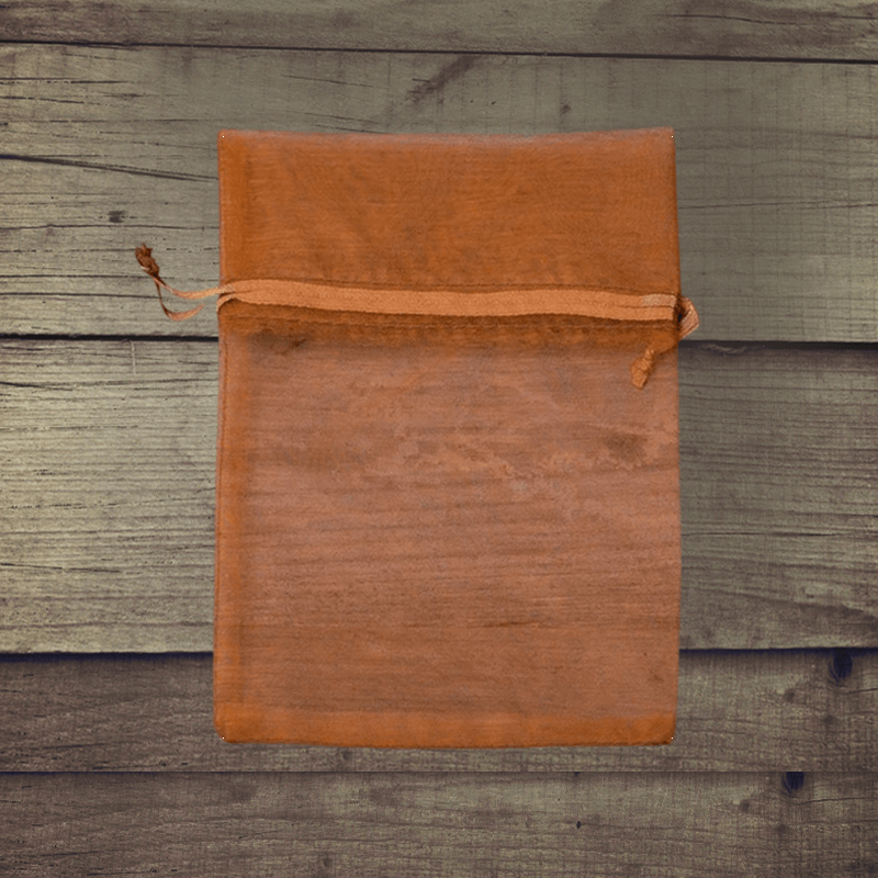 Praktyczny pakiet uniwersalnych 25 woreczków z organzy średniej wielkości w kolorze brązowym o wymiarach 13 cm x 18 cm.