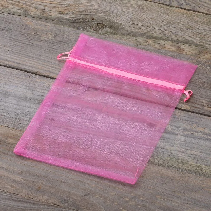 Zestaw 10 sztuk woreczków z organzy średniej wielkości w kolorze różowym o wymiarach 15 cm x 20 cm. Określa się je również jako woreczki tiulowe lub woreczki z tiulu.