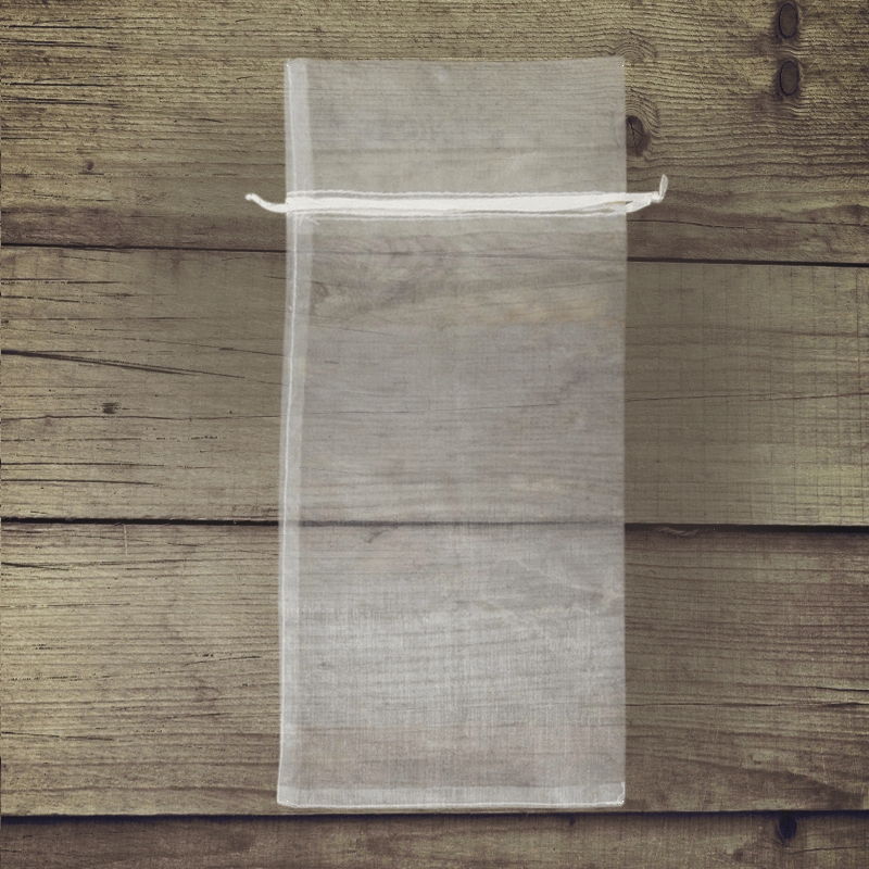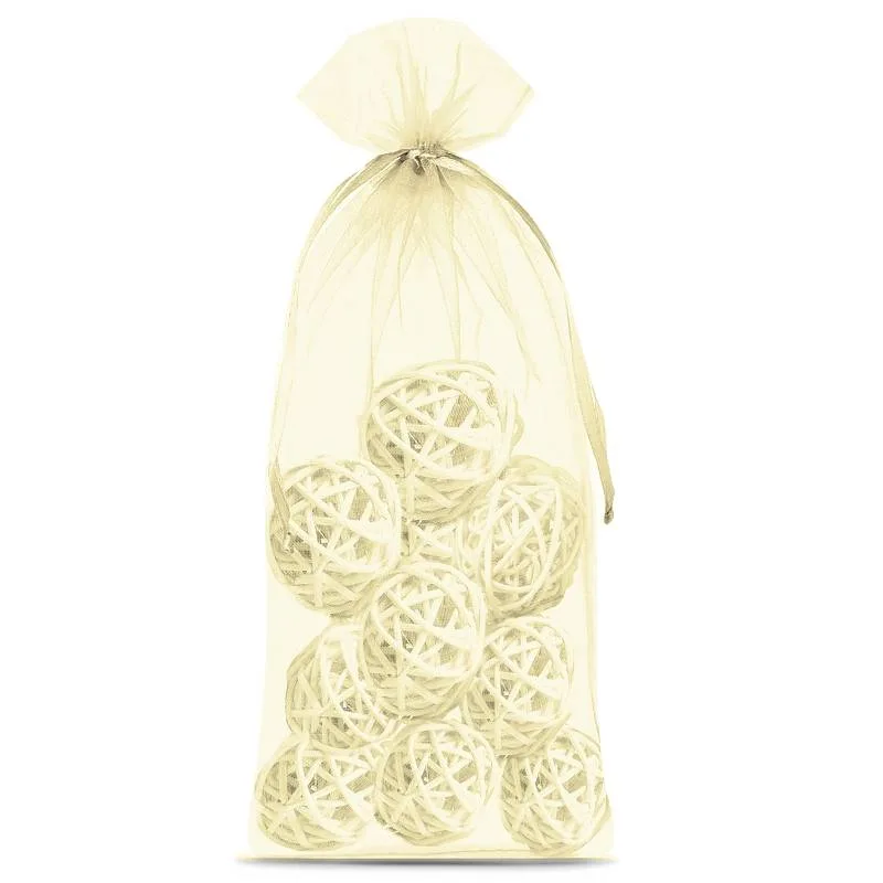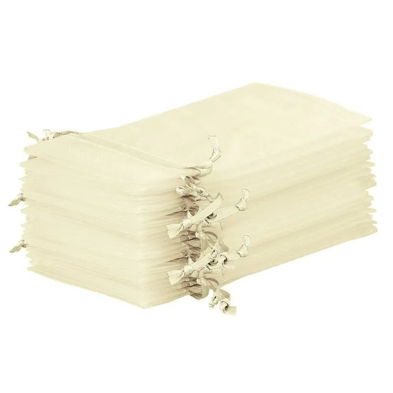Zestaw 10 sztuk woreczków z organzy średniej wielkości w kolorze ecru o wymiarach 15 cm x 33 cm. Określa się je również jako woreczki tiulowe lub woreczki z tiulu.