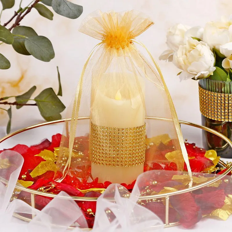 Złote woreczki z organzy 16 x 37 cm, 10 szt - opakowanie na butelki i zestawy