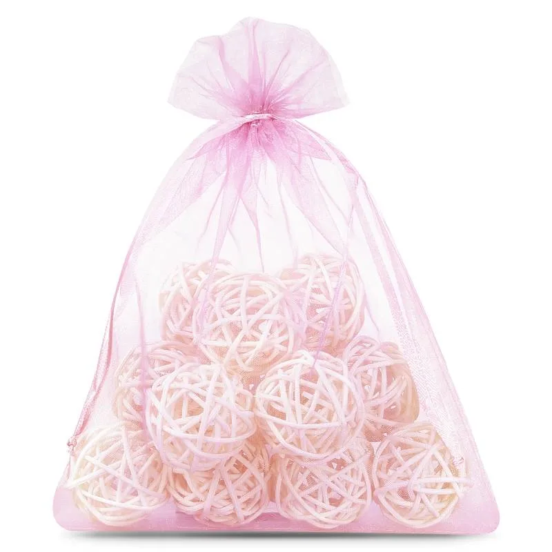 5 sztuk dużych woreczków z organzy w kolorze różowy jasny w rozmiarze 30 x 40 cm to bardzo praktyczny zestaw o szerokim zastosowaniu, który ułatwi organizację Twojego domu, a także sprawdzi się w sytuacjach bardziej oficjalnych.
