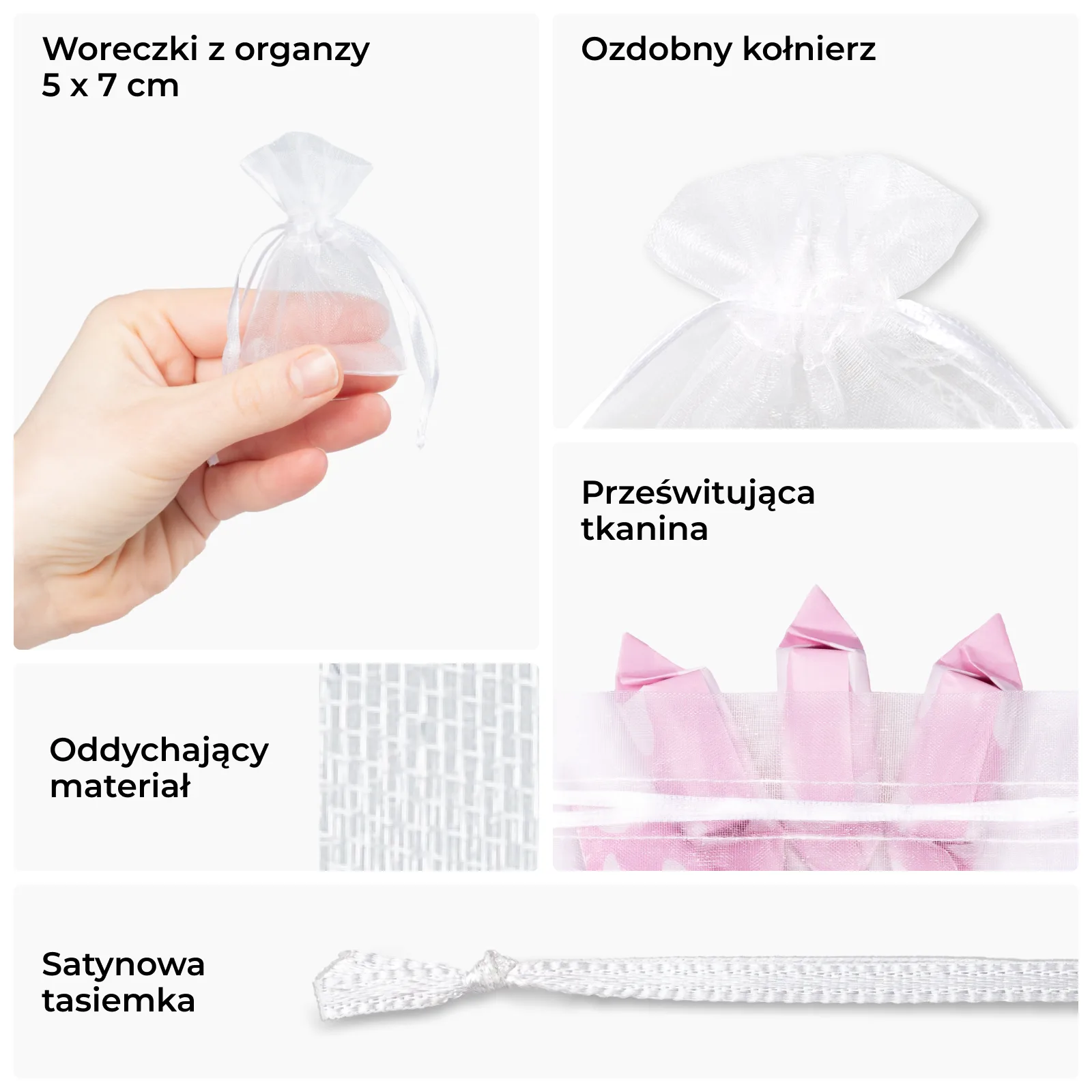 - Wygodne zamykanie: każdy woreczek posiada satynową wstążkę, która pozwala na szybkie i estetyczne zamknięcie.