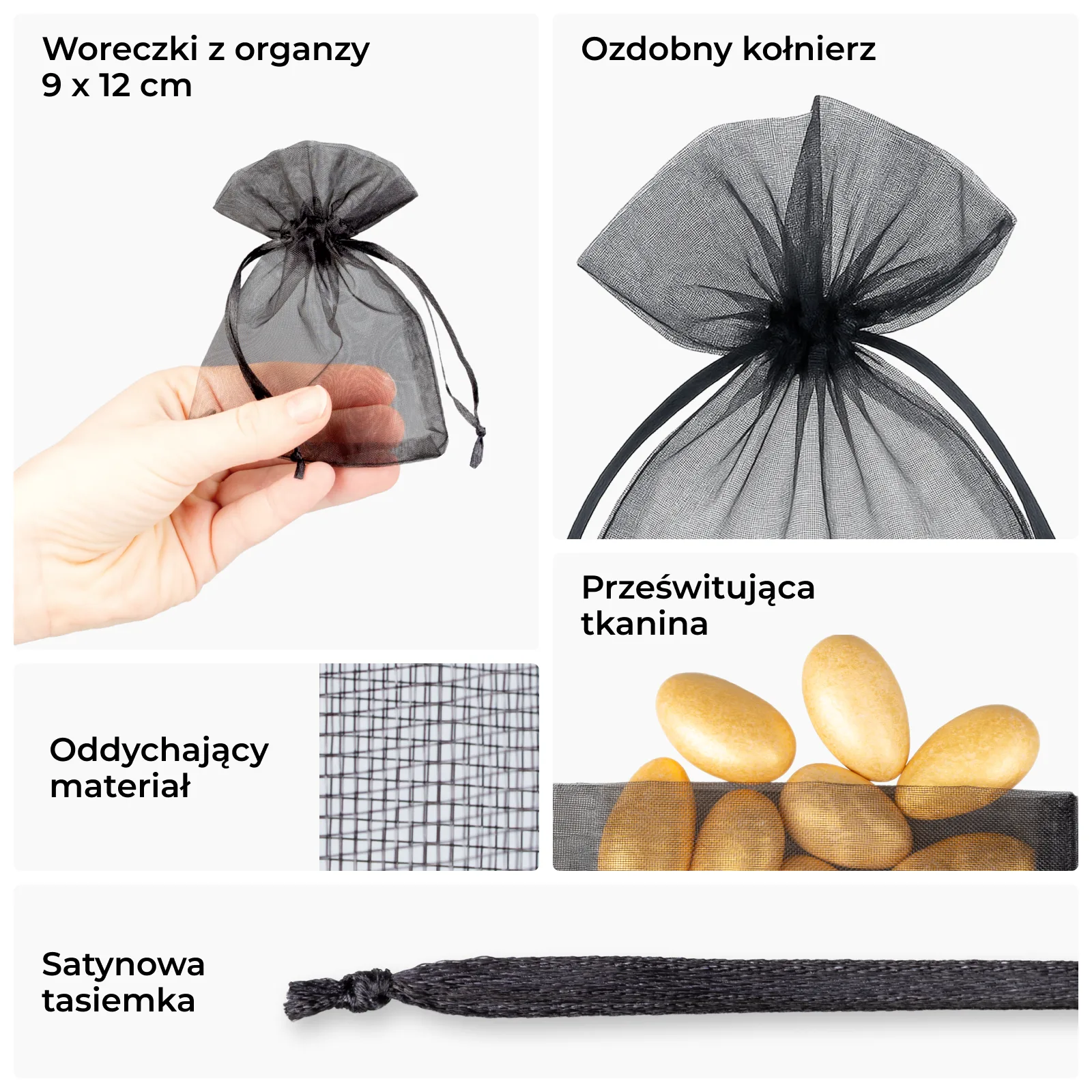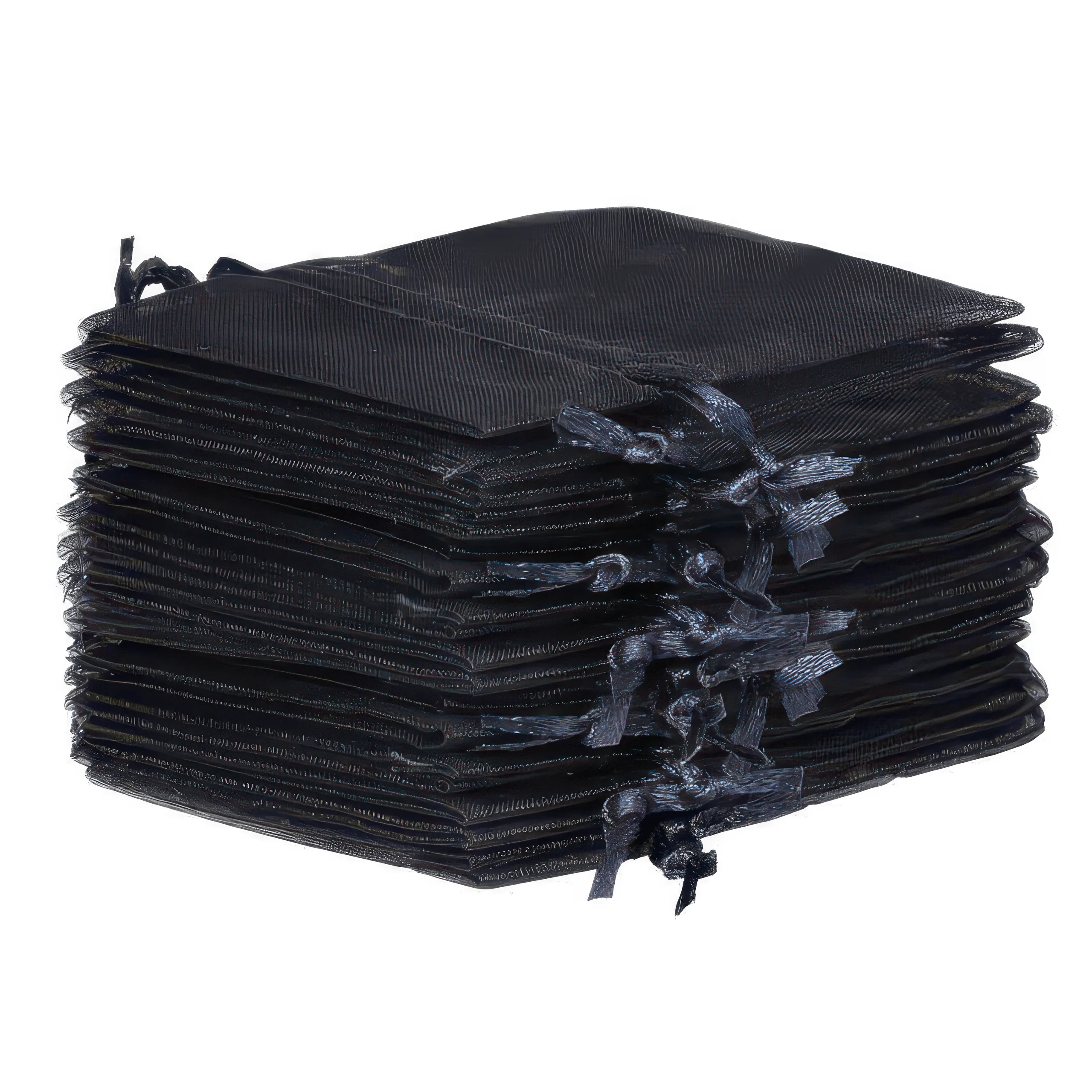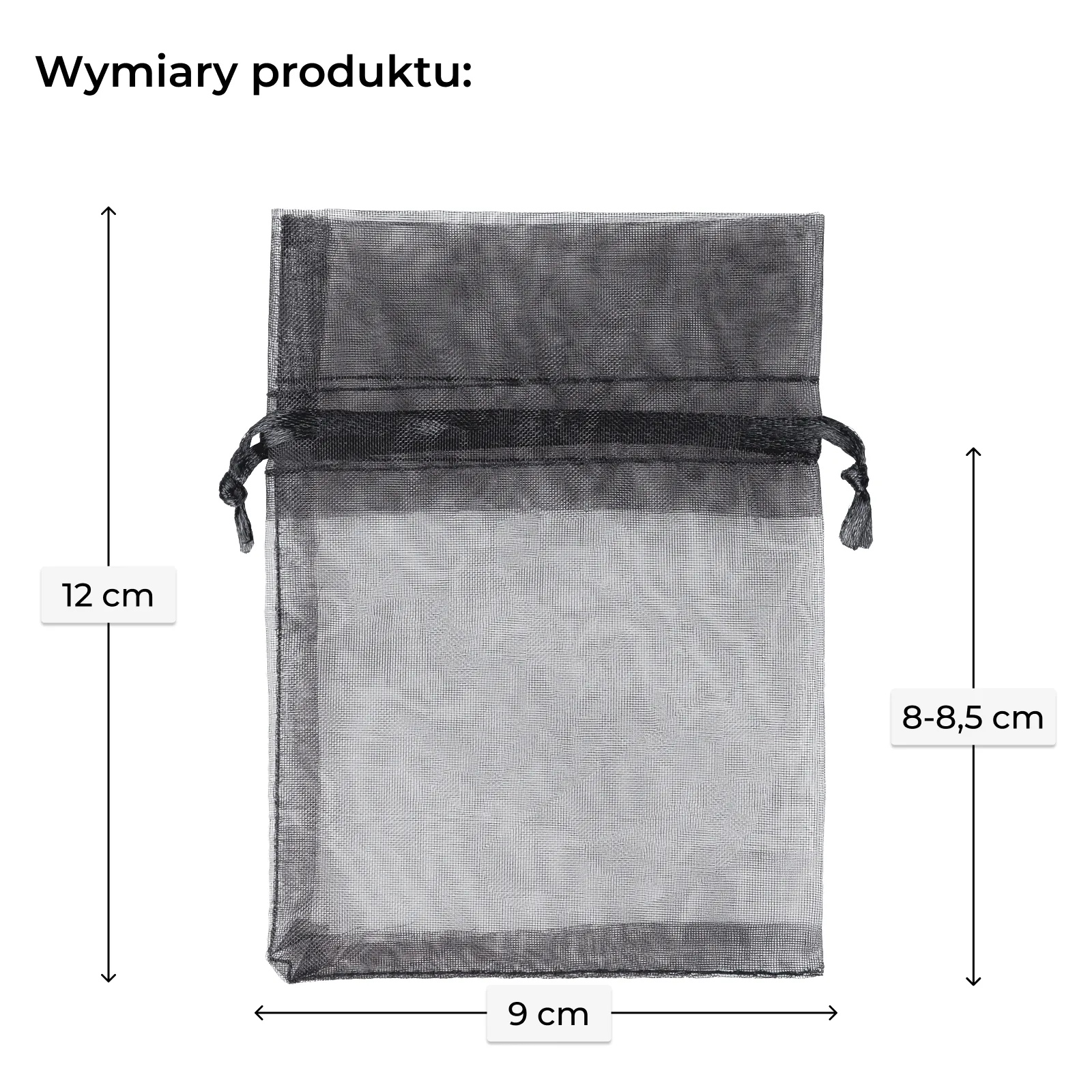 Zestaw niedużych woreczków z organzy o wymiarach 9 cm x 12 cm w kolorze czarnym. Ten praktyczny pakiet zawiera w sobie 25 sztuk, dzięki czemu jednorazowy zakup wystarczy na dłuższy czas.