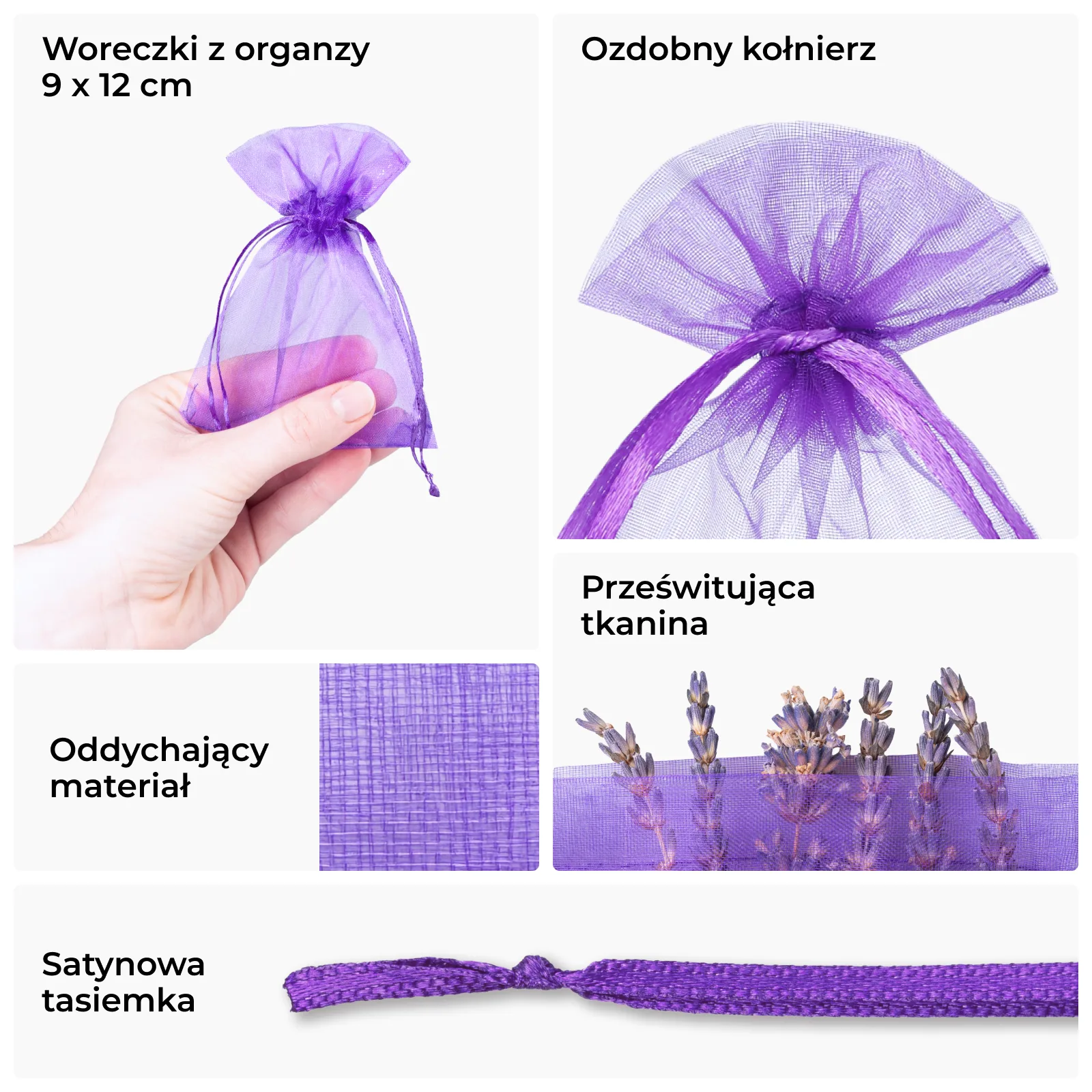 Organza to półprzezroczysta tkanina o subtelnym połysku, wykonana w 100% z nylonu. Jej struktura nadaje woreczkom lekkości, umożliwia eksponowanie zawartości i zapewnia przewiewność. Drobna, siateczkowa struktura sprawia, że organza bardzo dobrze przepuszcza aromaty (doskonale nadaje się do tworzenia woreczków zapachowych - często wybierane są przez plantatorów jako woreczki do lawendy).