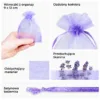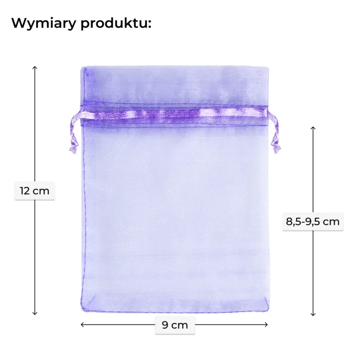 Eleganckie woreczki z organzy 9x12 cm w odcieniu fioletu. Zestaw 25 sztuk idealny do pakowania lawendy, biżuterii, próbek kosmetyków lub upominków dla gości na lawendowy ślub. Woreczki zamykane są podwójną satynową wstążką. To praktyczne i łatwe w użyciu opakowania wielokrotnego użytku.