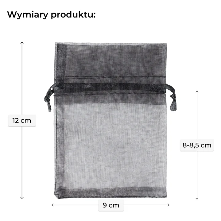 Zestaw niedużych woreczków z organzy o wymiarach 9 cm x 12 cm w kolorze czarnym. Ten praktyczny pakiet zawiera w sobie 25 sztuk, dzięki czemu jednorazowy zakup wystarczy na dłuższy czas.