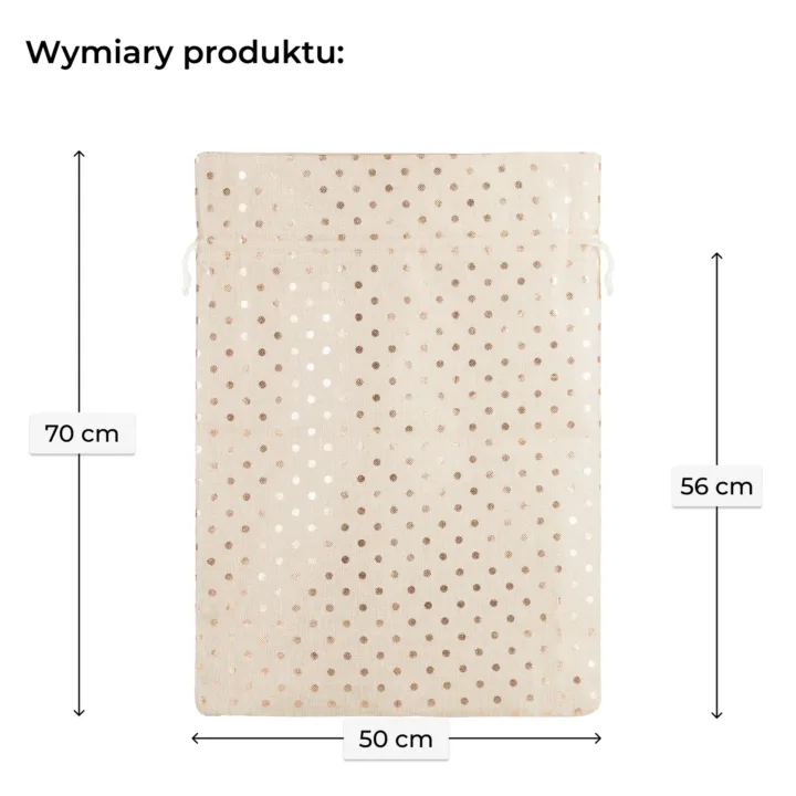 Podaruj bliskim niezapomniane wrażenia już od momentu wręczania! Nasz duży worek o wymiarach 50x70 cm to perfekcyjne opakowanie, które zamieni każdy upominek w prawdziwe dzieło sztuki. Wykonany z wysokiej jakości materiału stylizowanego na jutę naturalną, worek zachwyca naturalnym, ciepłym odcieniem beżu, idealnie komponującym się z eleganckimi, połyskującymi złotymi kropkami. Ten wyjątkowy wzór nadaje mu wyrafinowany i niezwykle dekoracyjny charakter.