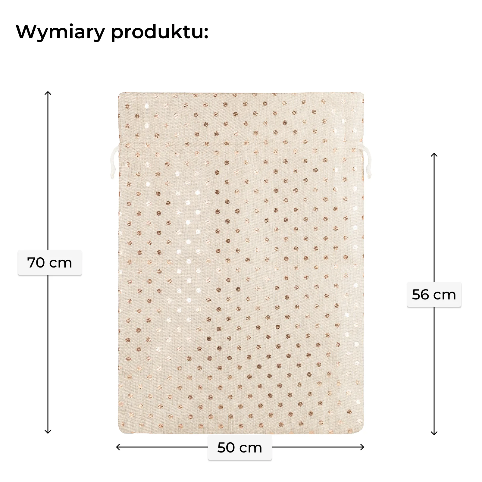 Duży worek z materiału juto-podobnego 50 x 70 cm - naturalny kolor z dekoracyjnymi złotymi kropkami.