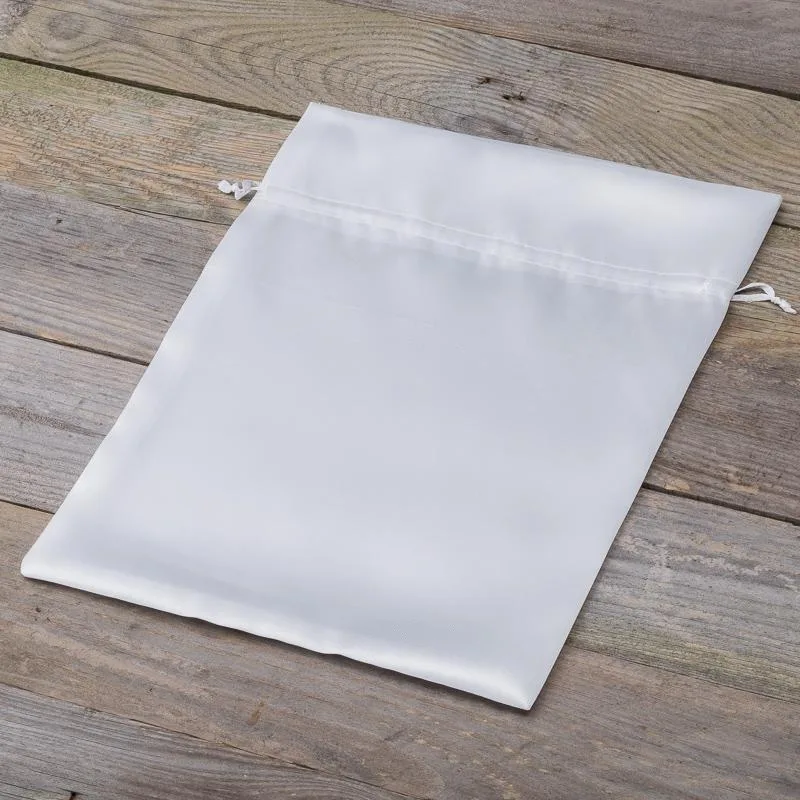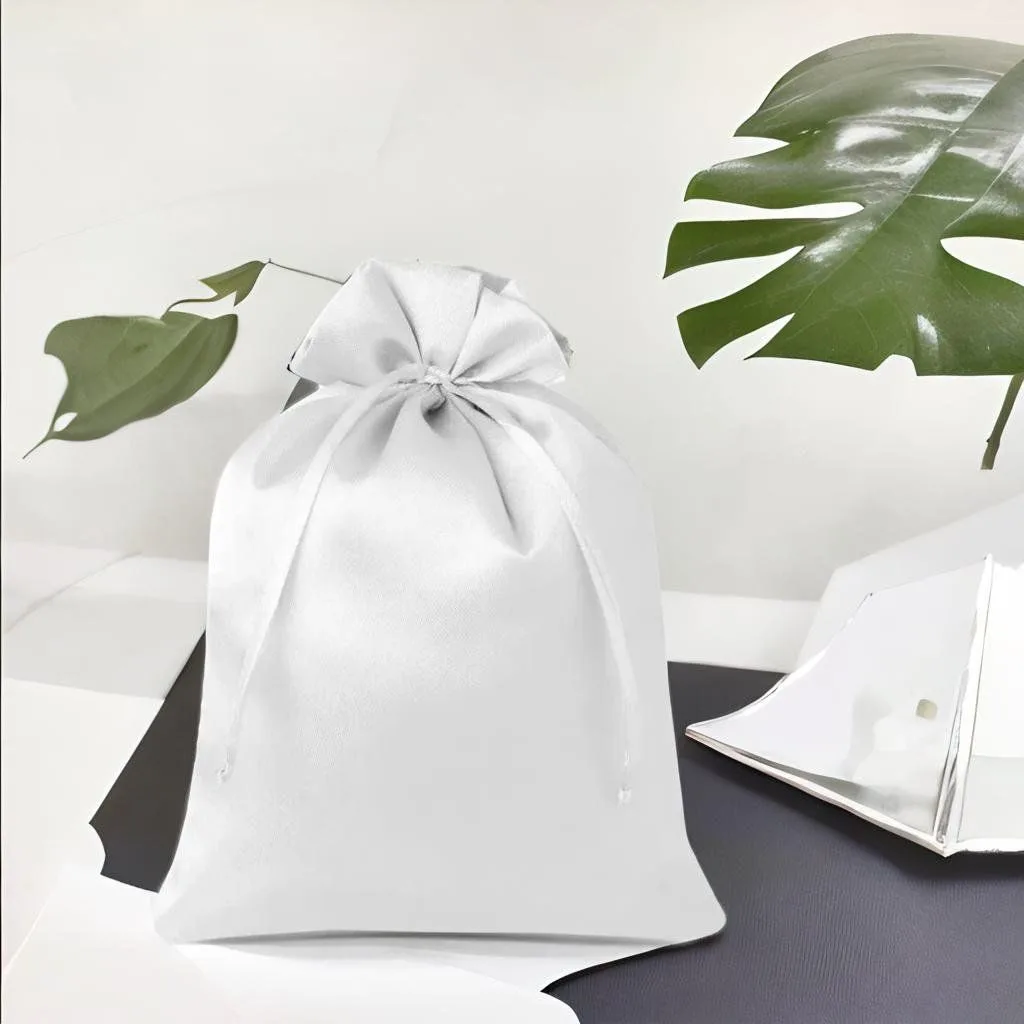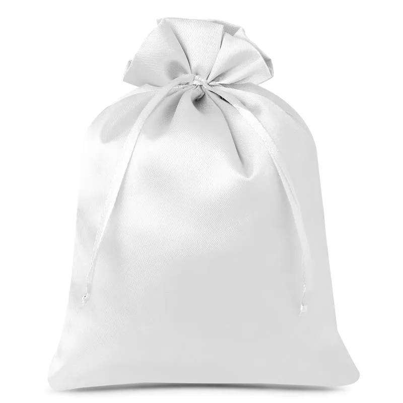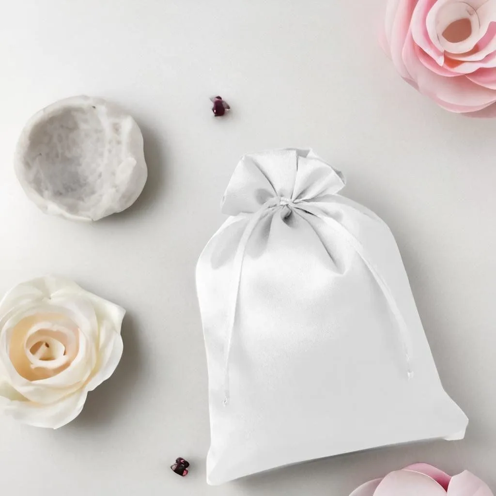 Pakiet 5 sztuk ozdobnych worków satynowych o wymiarach 22 x 30 cm w kolorze białym.