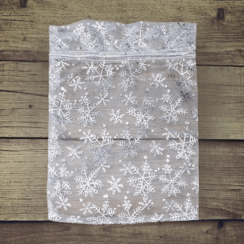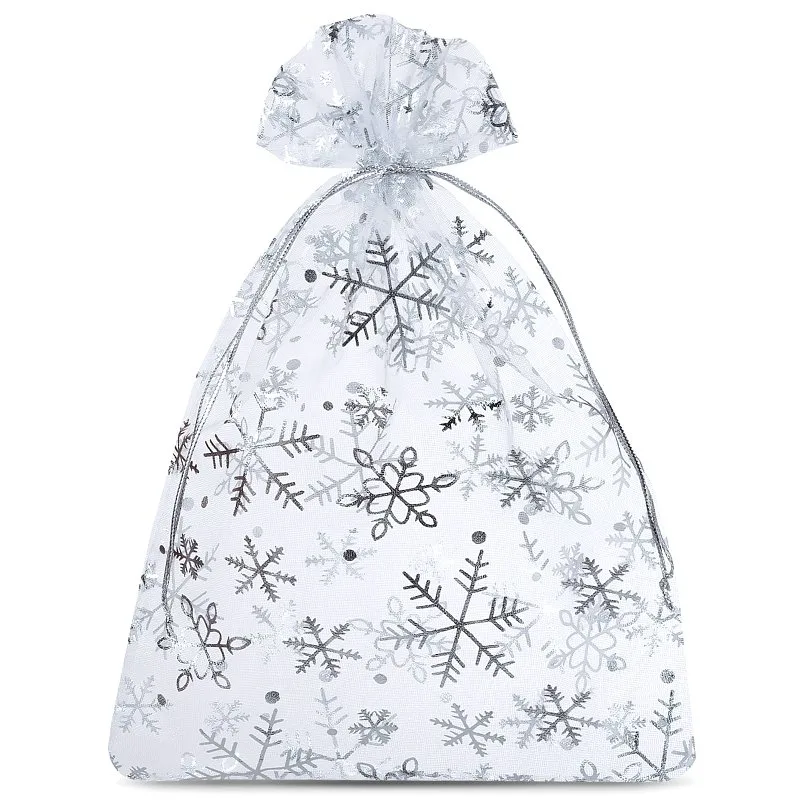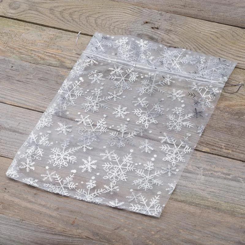 Praktyczny pakiet uniwersalnych 10 worków z organzy średniej wielkości w kolorze Boże Narodzeniem o wymiarach 22 cm x 30 cm.